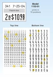 Monarch 1152-01 two line promotional labeler, Prints in up to 19 positions, Top line has 12 positions, Bottom line has seven large character print postions with the end two positions being underscored numbers